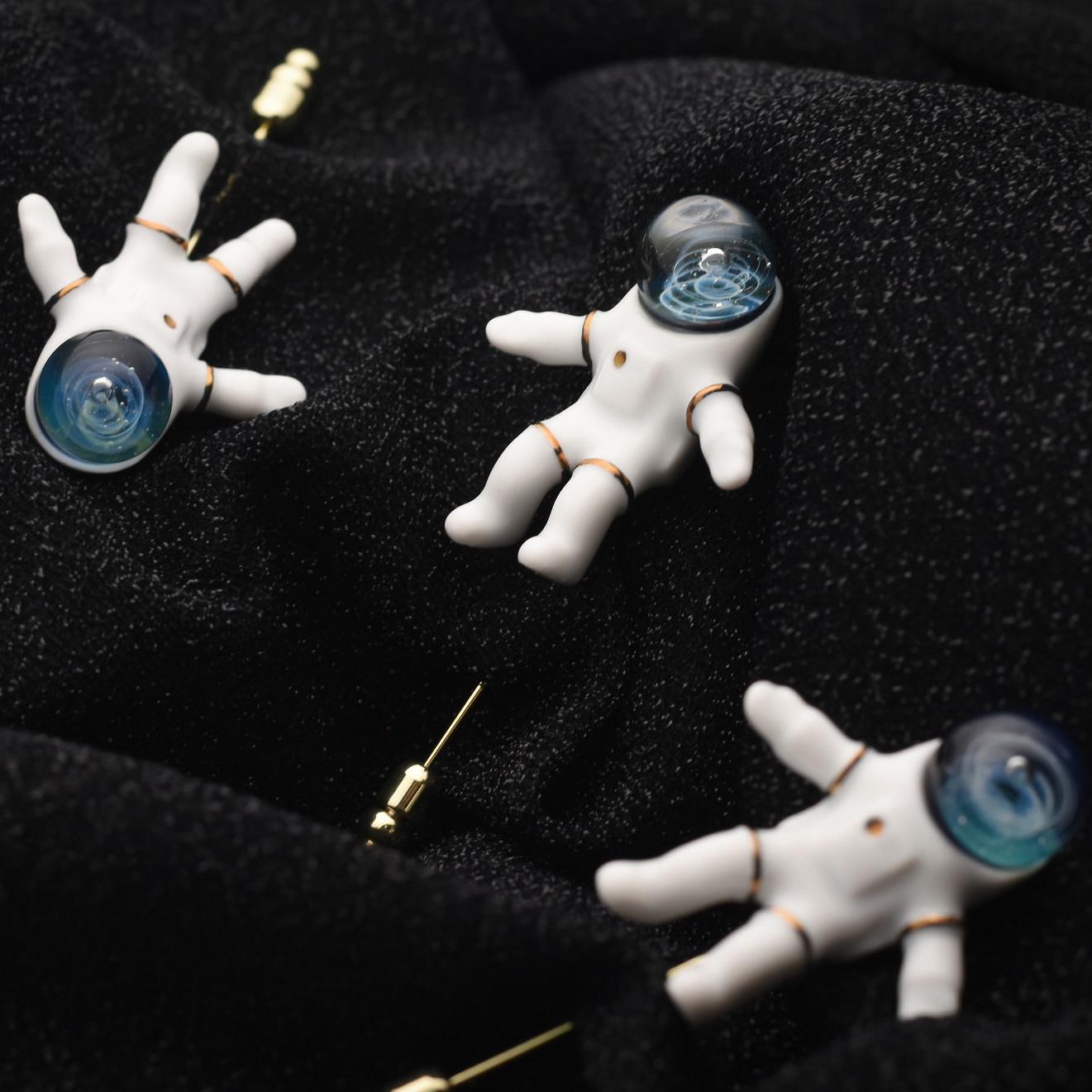 Each astronaut brooch is meticulously crafted by hand, ensuring no two are exactly alike. The delicate blown glass captures the beauty of space with its swirling colors and unique textures, making it a standout accessory for any outfit.